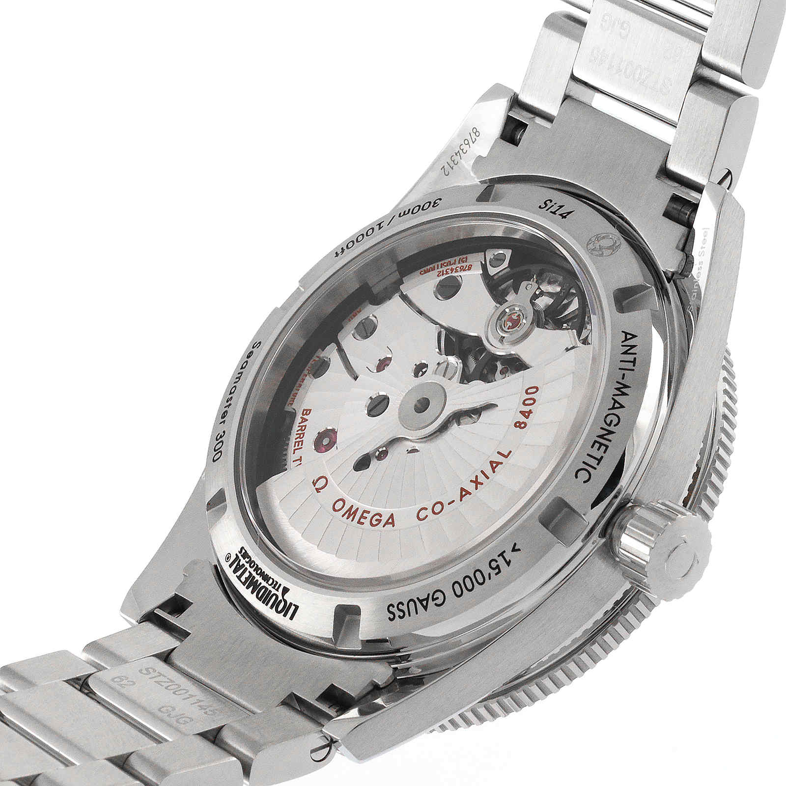 This Omega Seamaster 300 Men’s Watch is driven by Master Co-Axial movement calibre 8400, which can be seen at the heart of the timepiece through a transparent window on the back of the case.